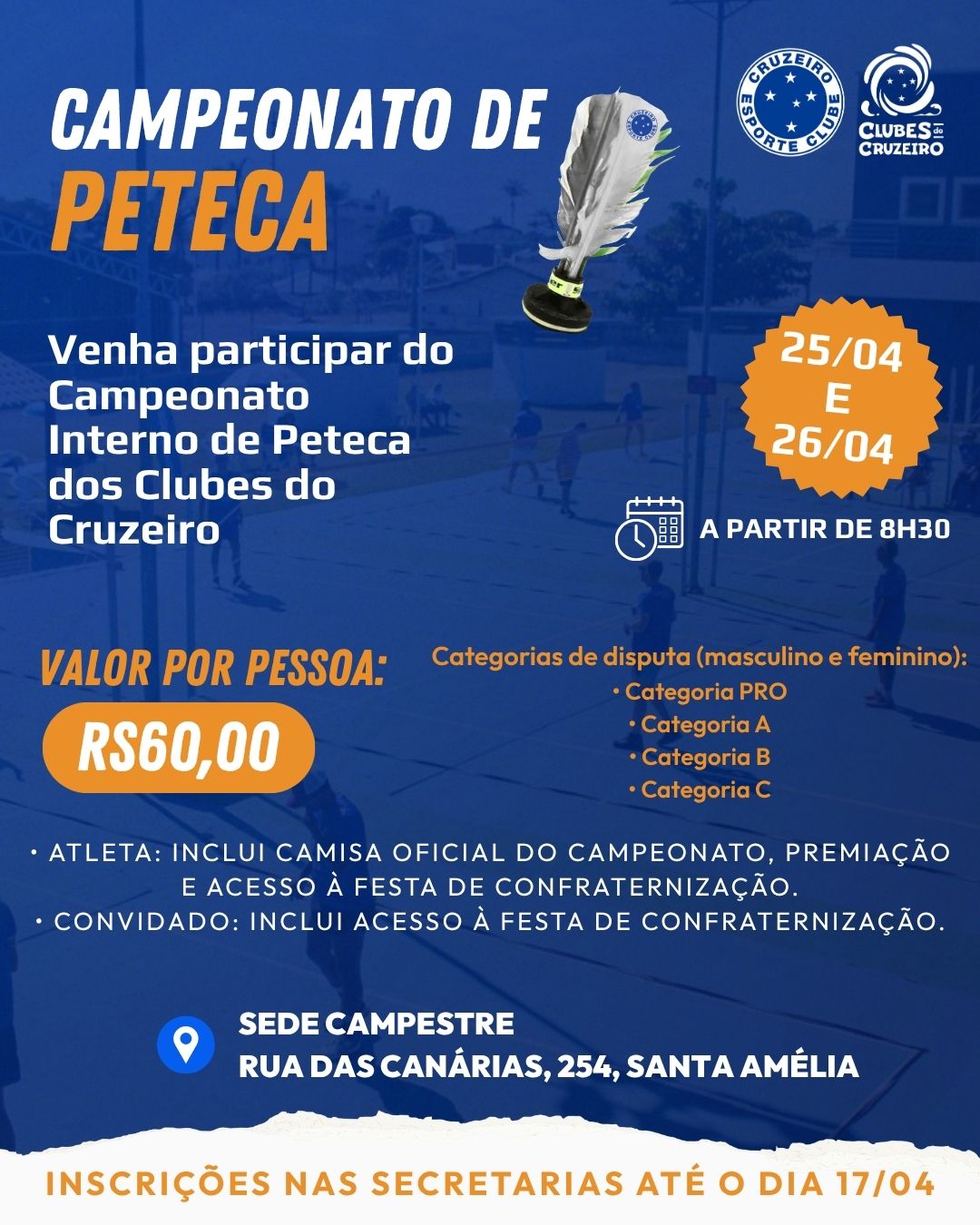 O Campeonato Interno de Peteca 2026 será realizado na Sede Campestre, reunindo associados para um fim de semana de integração, competitividade e confraternização. A programação acontecerá nos dias 25 e 26 de abril (sábado e domingo), com início às 8h30, nas quadras externas de peteca do clube. A taxa de inscrição para atletas é de […]